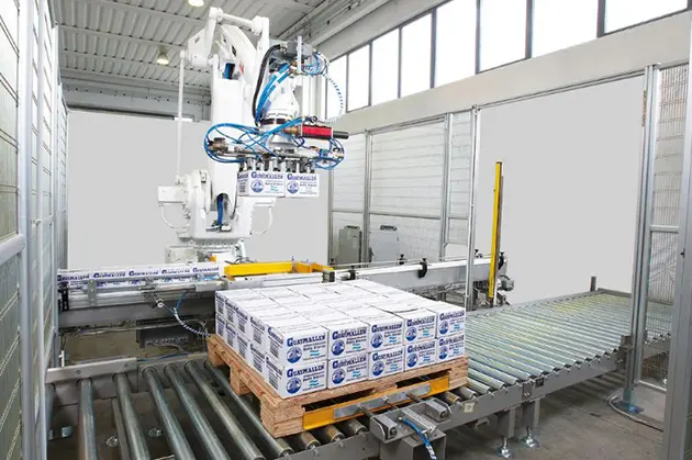 A camera guided robotic palletizing system stacks fresh milk master cases efficiently, improving palletizing performance and reducing safety risk.