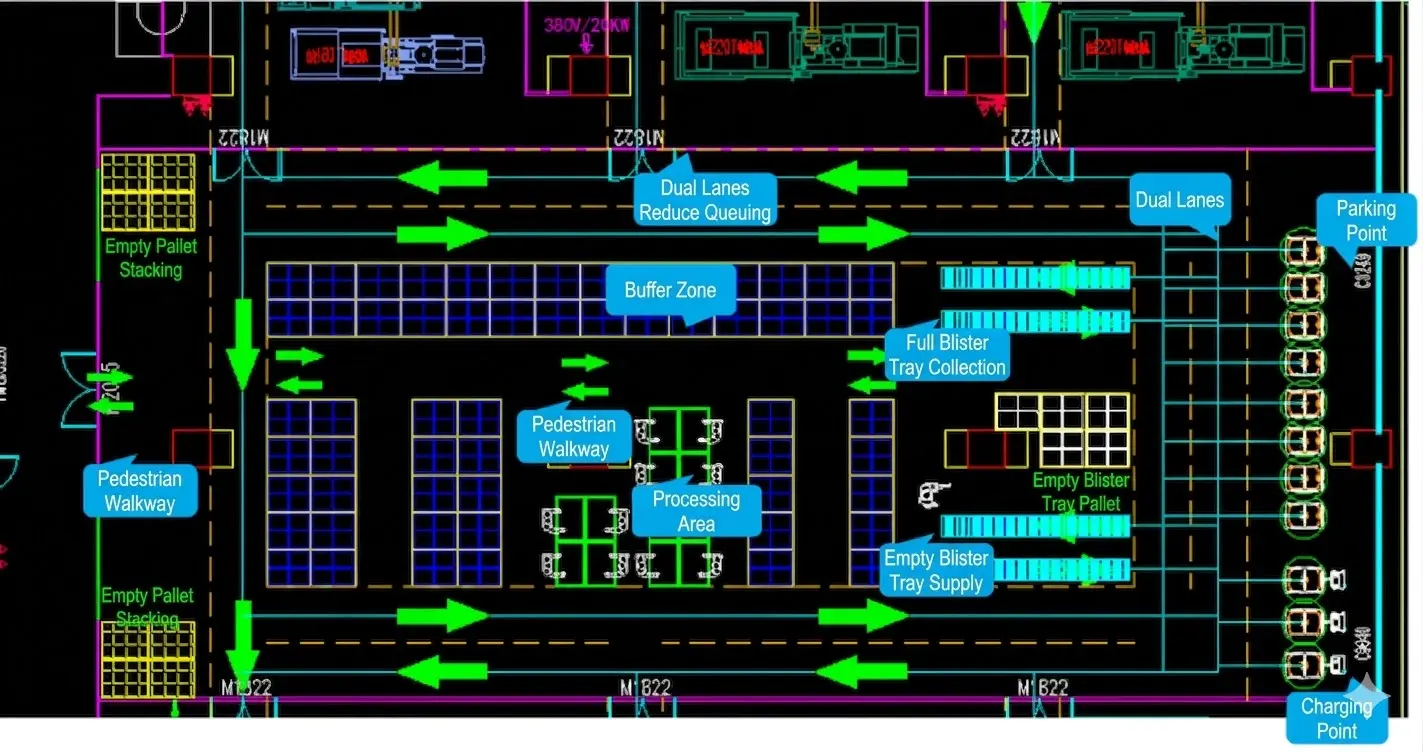 Note: A combined operation means the AGV completes one trip by delivering one full blister tray load and returning with one empty blister tray bin. In this project, all quantity calculations are based on one full load bin and one empty bin per trip. Based on this model, the required quantity is 9 roller type AGVs. To handle peak flow more reliably, we recommend purchasing 11 AGVs.