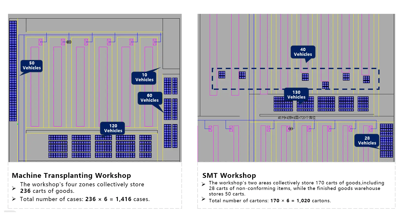 Note: The flow data above was calculated based on the daily cart transport volume provided by the client and used to estimate the warehouse inbound and outbound throughput per hour. The follow up solution design was developed based on this flow rate.